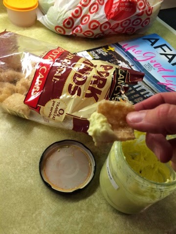 My favorite snack is pork rinds dipped in homemade mayo. Crunchy, creamy, tasty! Pork rinds are awesome, they don't have any carbs and are less calories than potato chips. And homemade mayo is great! I used extra-virgin olive oil that has a strong olive taste which is a little overpowering. I'm glad I got light olive oil for my next batch so it's a little more milk. I'm the only one who eats the mayo, but that's not a problem, I put it on a lot of things.